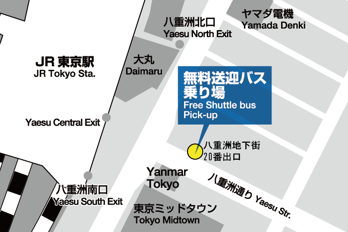 八重洲中央口を出て直進し、交差点を渡った後、八重洲地下街20番出口付近でお待ちください。 ※ 道路状況によって場所が前後する場合があります。 ※ 日によって運行台数が異なりますので、詳細はフロントまたはドライバーにご確認下さい。 ※ 東京駅からホテルまでの所要時間は15~20分程度です。