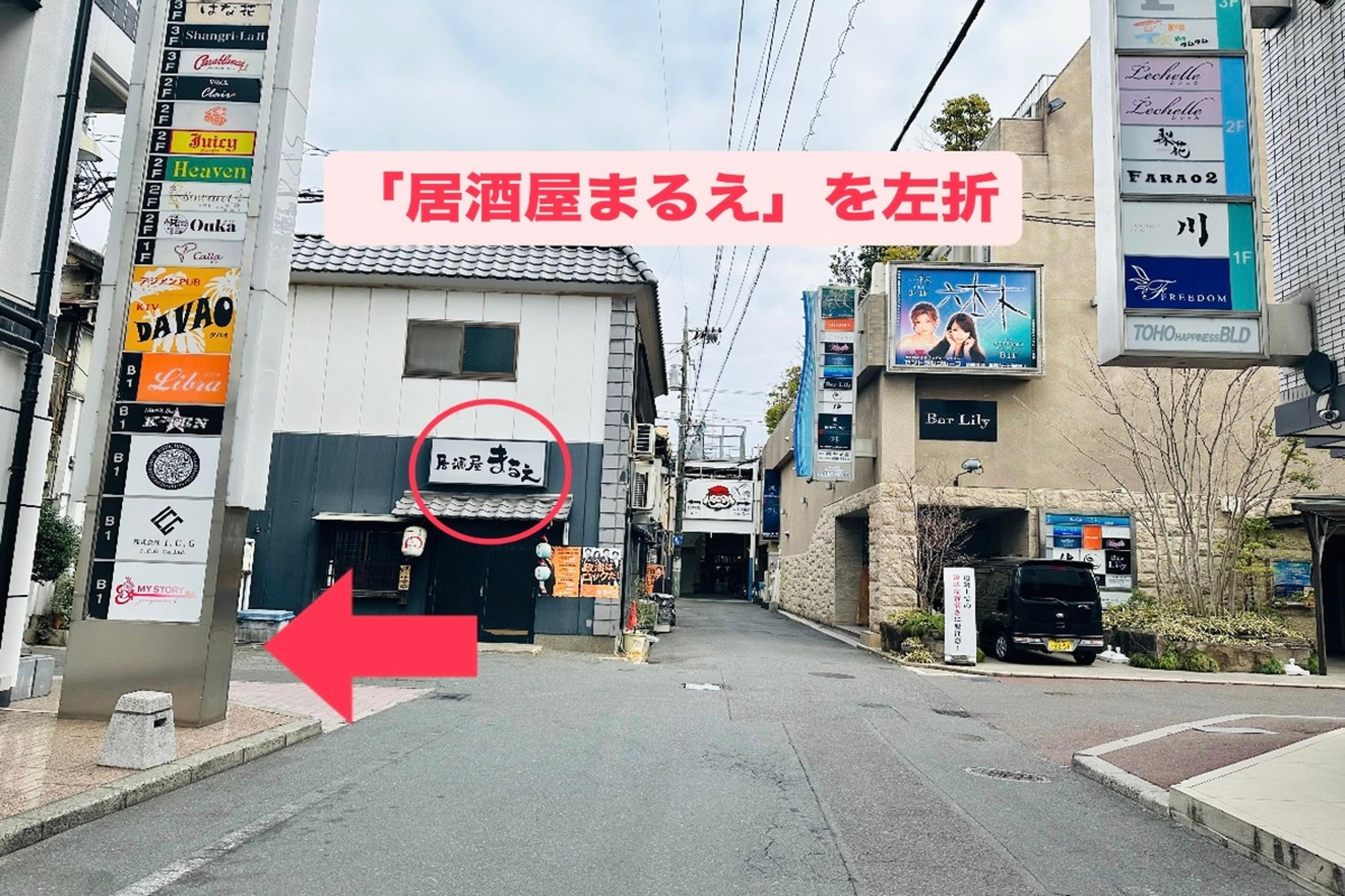前方に「居酒屋まるえ」の看板が見えます。ここを左折します。