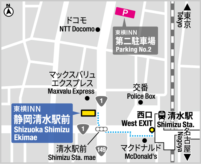 新幹線のお客様は「東京駅」からひかり号で(約1時間)「静岡駅」でJR東海道本線に乗り換え3駅